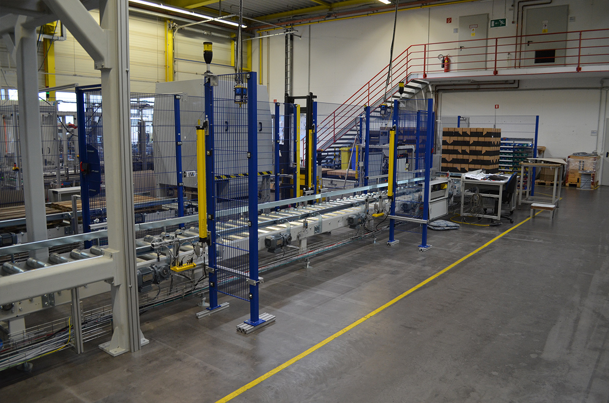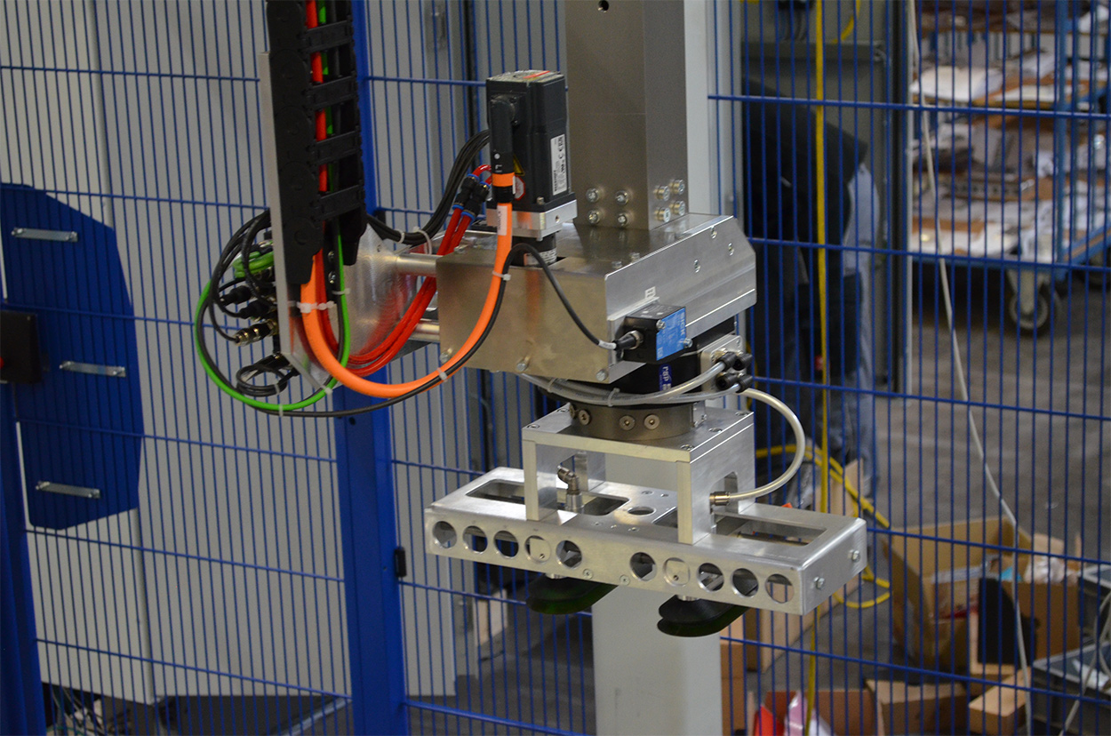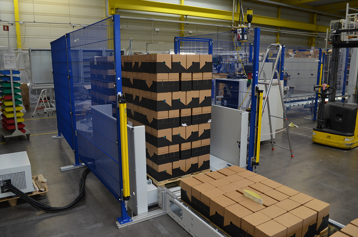 We developed a highly flexible palletising solution, which manages up to 20 cartons per minute including an optional intermediate layer. Autonomy was increased by integrating a fully automatic empty pallet magazine. A label printing dispenser system with a front and side applicator was integrated for the double labelling. Autonomously operating systems collect two pallets at the same time. We have provided interfaces to the modular expansion from a design perspective.