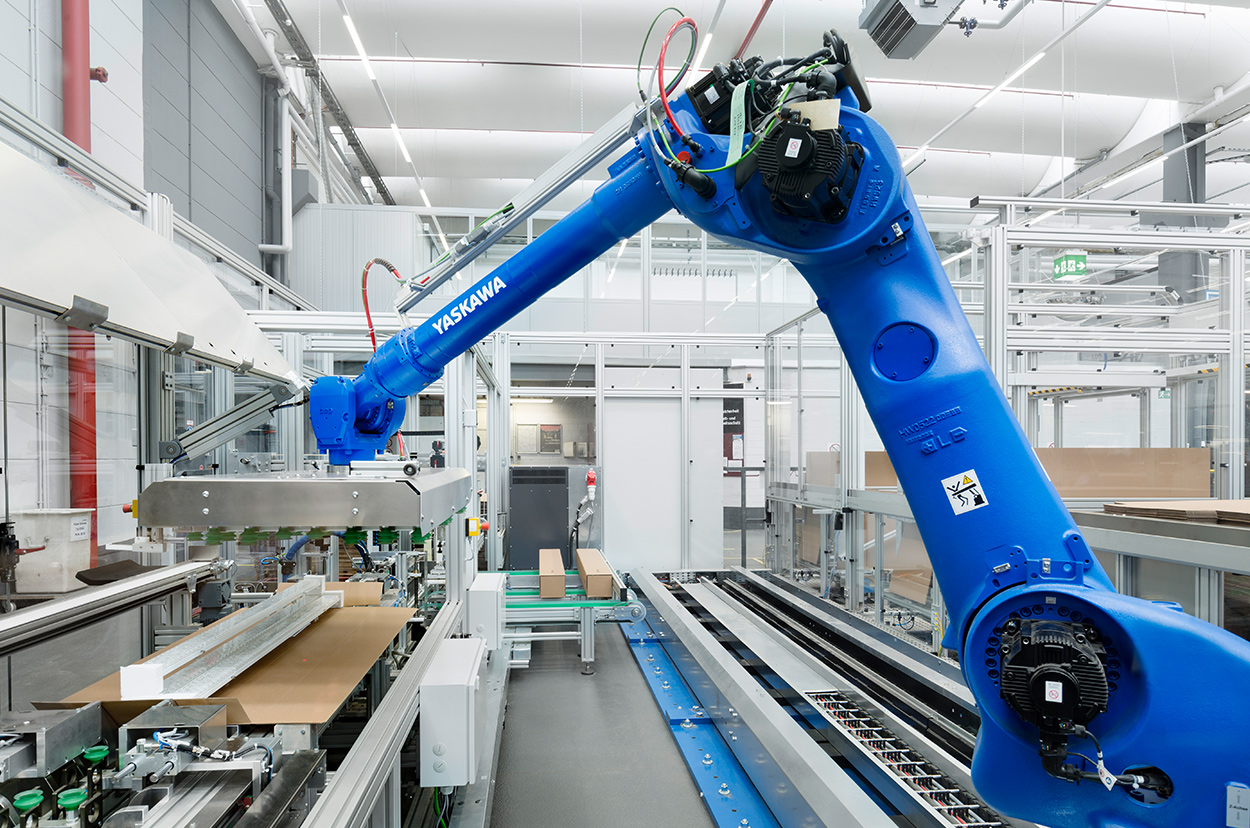 The lights are passed directly from the fully automated installation plant to the PKM packaging plant. A 6-axle robot on an additional seventh movable axle collects the pre-cut parts, which can be up to 2,500 mm long, directly from the pallet. The robot lays the lights as a single pack or also as a 4-pack on the prepared corrugated cardboard pre-cut parts, where it has already previously provided the installation instructions. As soon as the lights are on the pre-cut part, the latter is sucked from the bottom and then wrapped around. The carton is sealed on a short closing section using hot glue. After it has been sealed with the hot glue, a whole layer is collected and then placed in the pallet carton. Two places are provided in each case both for the pre-cut parts as well as for the pallet cartons, so that the plant can always continue working without stopping.